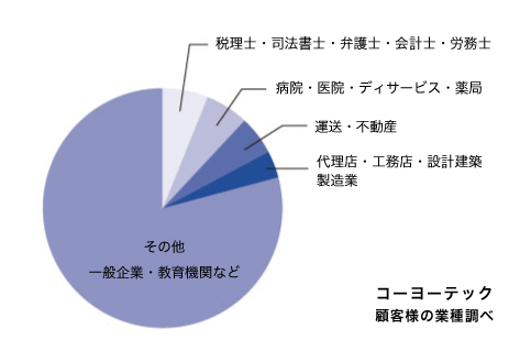 お客様の業種はさまざまですが、病院・医院・クリニック・動物病院・ディサービスや薬局をはじめ、税理士・司法書士・弁護士・会計士・労務士、自動車販売・運送・保険代理店、不動産・工務店・設計建築・製造業・制作会社などが比較的多く、その他一般企業や教育機関ともお取り引きさせて頂いております。